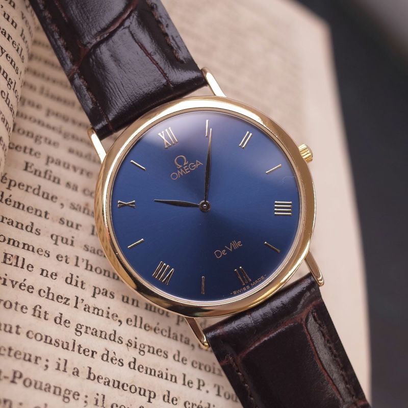 オメガ デビル ロイヤルブルー SS/GF ローマン リーフ針 新品革ベルト 純正尾錠 メンズ クォーツ 腕時計 OMEGA 1年保証