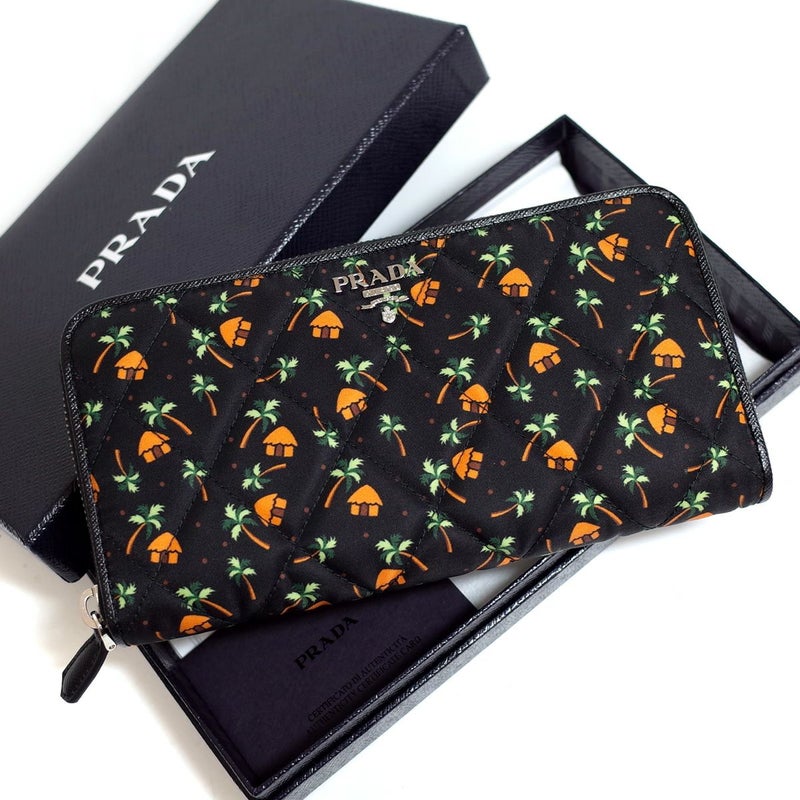 新品同様♪【プラダ】ラウンドファスナー長財布 キルティング 家&ヤシの木 ブラック 1ML506 箱/カード付 PRADA