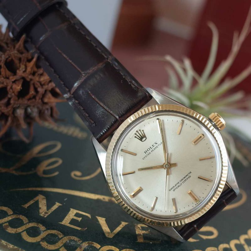 イエローゴールドのコインエッジが上品なケースに柔らかい色にやけた美しい文字盤です。