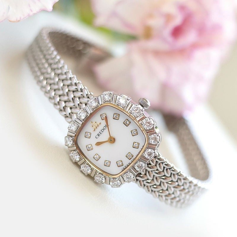 極小のホワイトシェルフェイスにダイヤインデックスがきらめく、繊細で華やかな美しいお品。