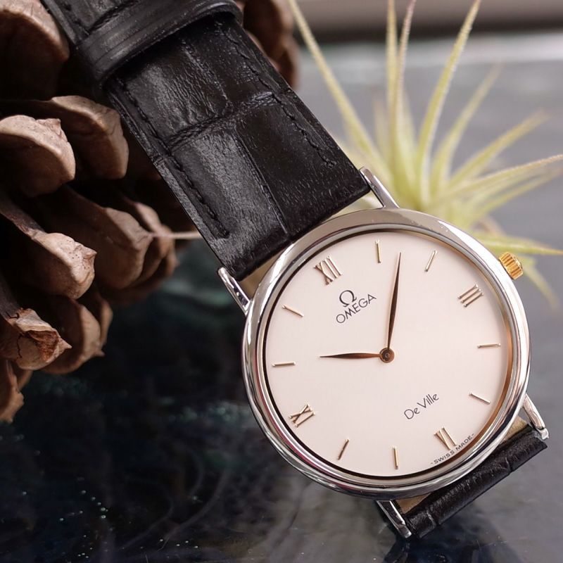 訳有 オメガ デビル 195.0075 SS コンビ ローマンインデックス リーフ針 新品ベルト 純正尾錠 メンズ クォーツ 腕時計 OMEGA OH済1年保証