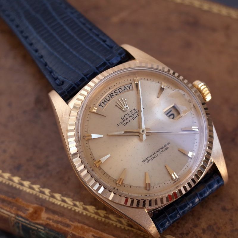 陰影の美しいフルーテッドベゼルに、多面カットのくさびインデックスが角度を変えるたび静かに輝きます。 縁周りの段差がフェイスに奥行きを感じさせ、シャープなドルフィン針が映えるクラシックなデイデイト。 18金イエローゴールドの温かみのある輝きが、落ち着いた品格を引き立てます。 ダイヤル全体にはドット状のエイジングが見られますが、視認性や上品さを損なうものではなく、