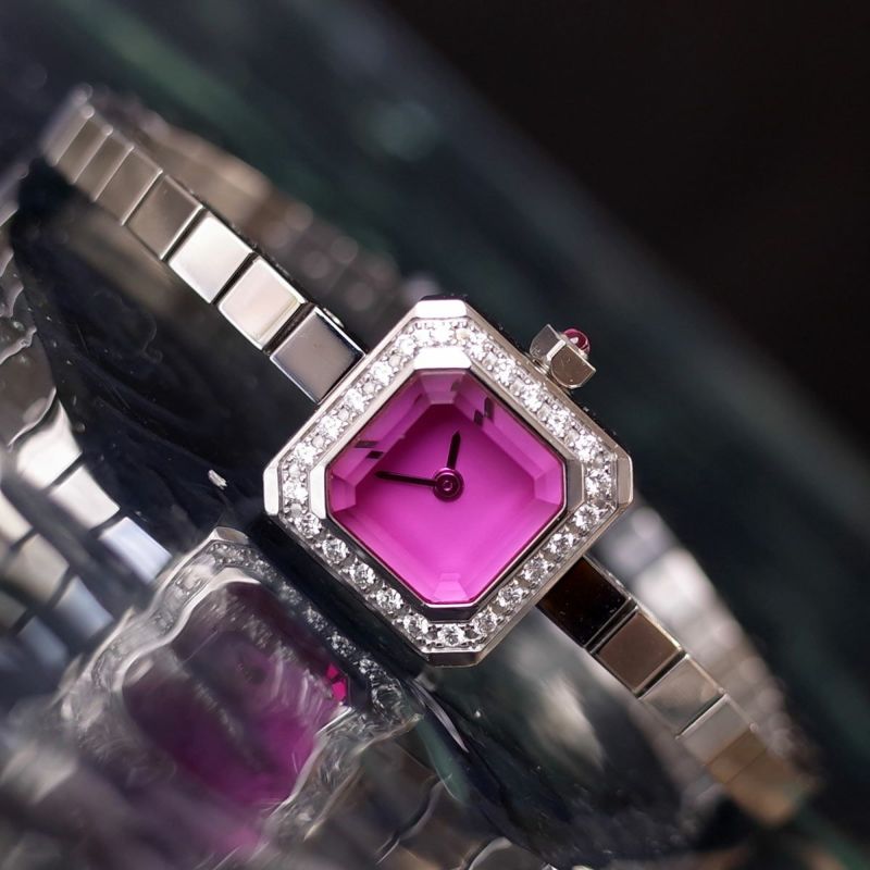 極細キューブ型のブレスレットに、ダイヤがきらめく個性的なジュエリーウォッチです。