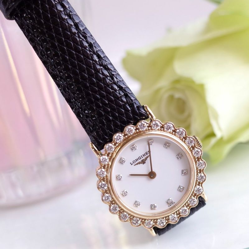 花びらを思わせるダイヤベゼルが愛らしく輝きます。