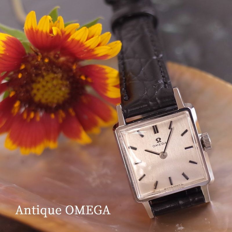 ヴィンテージらしい、スクエアケースにΩマークのプラスティック風防